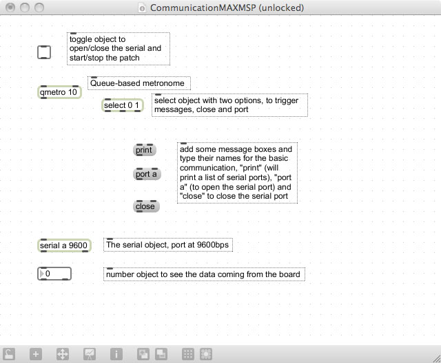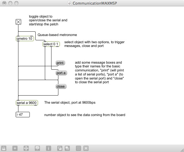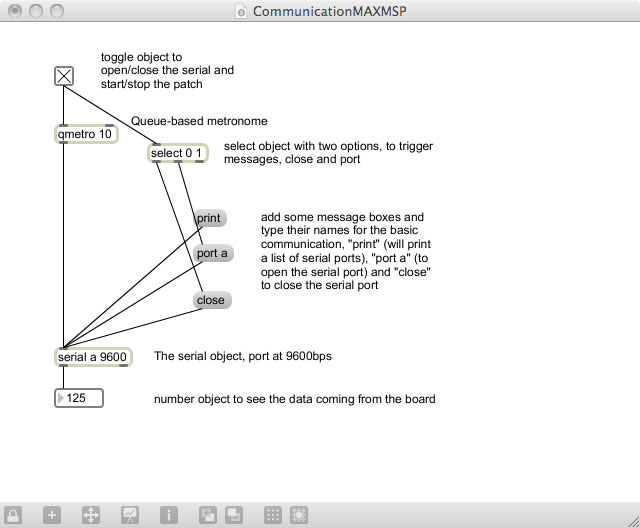 Este tutorial presenta la comunicación básica entre el hardware Wiring y MaxMSP http://cycling74.com. El objetivo del tutorial será leer valores simples desde la tarjeta Wiring. Se asume que el software de Wiring y MaxMSP están instalados y Wiring previamente ha sido ajustada correctamente. Para más información sobre la instalación de Wiring revise los tutoriales acerca de la instalación de Wiring y el ajuste del software. El código completo del ejemplo (ambos Wiring & MaxMSP esta en sección de Examples -> Topics -> Other Software aquí.