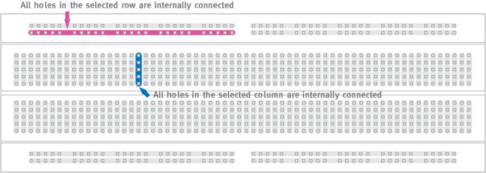 Un breadboard (protoboard) es un dispositivo para prototipado temporal sin soldadura con componentes electrónicos y probar diseño de circuitos. La mayoria de los componentes electrónicos en circuitos electrónicos pueden ser interconectados insertando sus conecciones o terminales en los huecos y luego haciendo conecciones a través de cables donde es apropiado. El breadboard tiene líneas metálicas que están establecidas como se muestra más abajo. Note que las líneas de puntos de arriba y de abajo están conectadas horizontalmente y divididas en la mitad mientras que el resto de los huecos están conectados verticalmente.