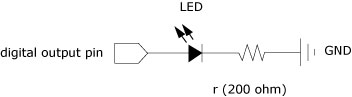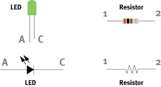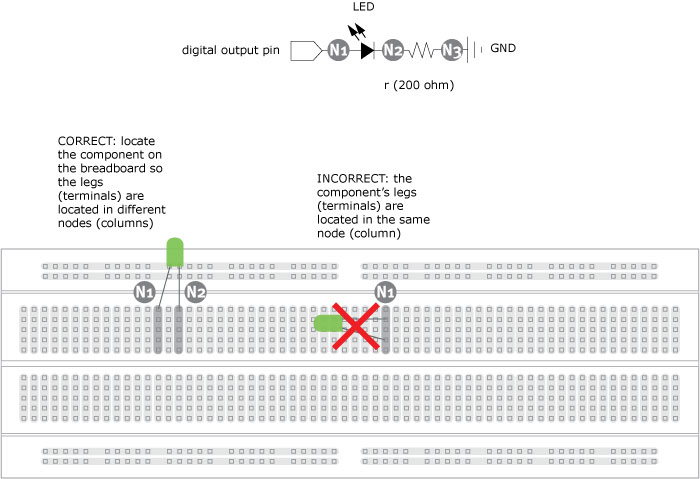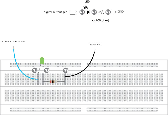 El LED tiene dos patas, en el segundo diagrama la pata marcada como A está conectada al pin I/O digital (Nodo N1), la pata marcada como C está conectada con la pata marcada como 1 en la resistencia (Nodo N2) y la pata marcada como 2 en la resistencia está conectada a GROUND (Nodo N3). El LED es un dispositivo polarizado, lo que significa que el modo como es conectado es importante, la resistencia no está polarizada por lo tanto los pines pueden ser invertidos sin ningún efecto en el comportamiento del circuito. Para aprender más acerca de un componentes específico trate de encontrar su datasheet. Busque en la Web usando el número de referencia del componente para familiarse con sus funciones, terminales y especificaciones.