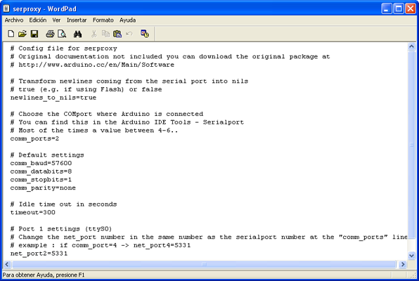 comm_ports=6 ( o el COMport que esté usando la tarjeta. Para conocer el puerto dirijase en el Wiring IDE a Tools->Serial Ports.)