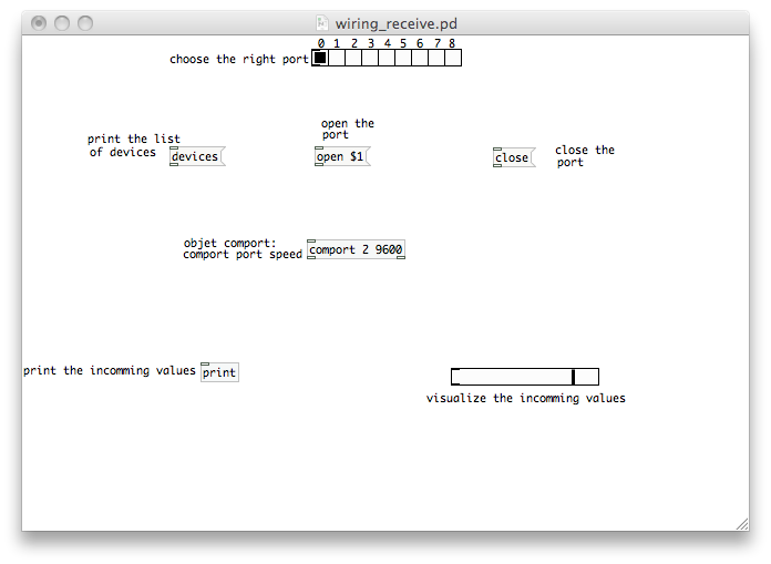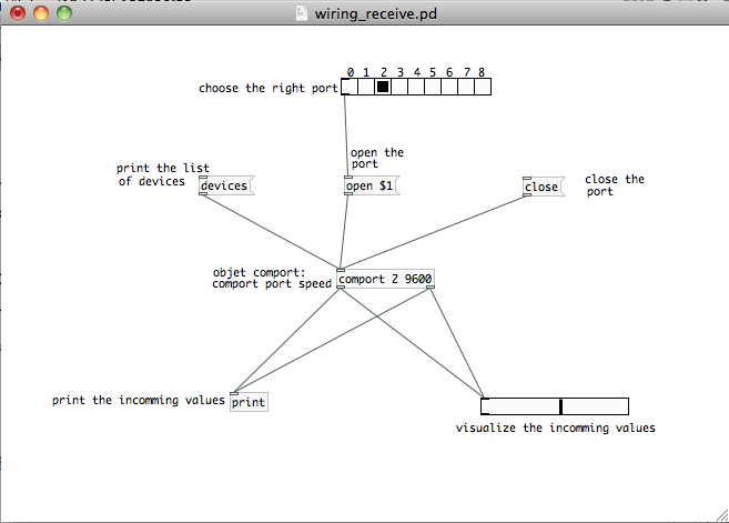 Ubicar las conecciones a veces produce un parche más legible, ahora que el parche está listo para ser probado, asigne el puerto correcto en la lista, automáticamente el puerto empezará a recibir datos. Los datos entrantes serán mostrados en la consola y visualizados en el slider horizontal.