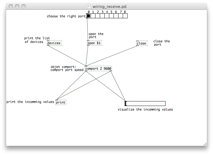 Este tutorial presenta la comunicación básica entre el hardware Wiring y Pure Data http://puredata.info. El objetivo del tutorial será leer valores simples desde la tarjeta Wiring. Se asume que el software Wiring y Pure Data está instalado y los ajustes apropiados de Wiring han sido completados. Para más información acerca de la instalación de Wiring revise los tutoriales sobre la instalación y los ajustes del software.