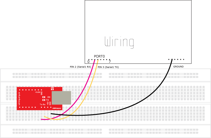 Nota: Recuerde el puerto usado para cargar programas en el hardware Wiring es llamado Serial y esta disponible en los pines 32 y 33. El segundo puerto serial esta disponible en los pines 2 y 3 y es llamado Serial1. Serial1 puede ser usado para conectar dispositivos seriales adicionales o incluso un segundo Wiring USBAdapter si es necesario.