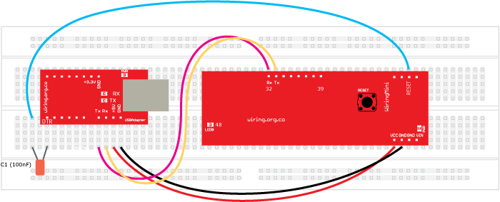 Habilitar el reset automático para la carga de los códigos: Es posible habilitar la característica del reset automático en la WiringMini, entonces no necesita presionar el botón de reset para cargar o re inciar un nuevo programa. solo adicione un condensador de 100nF entre el pin serial DTR en el USBAdapter y el pin RESET en la WiringMini como se muestra en wl diagrama de abajo: